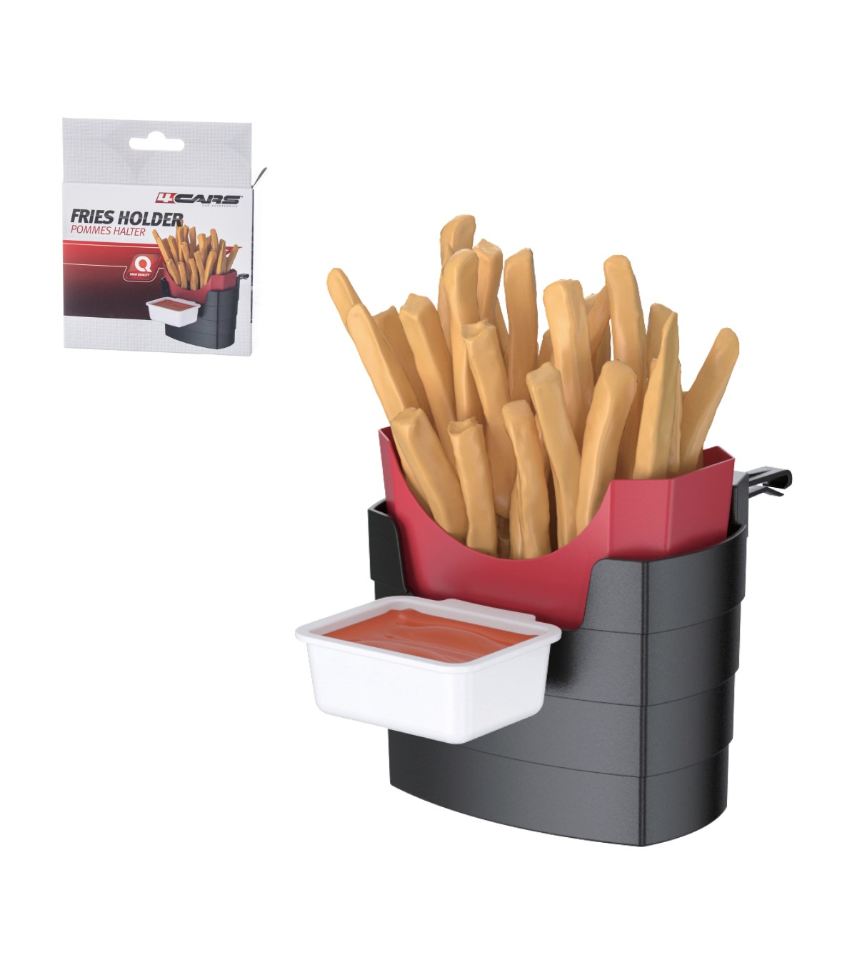 Držiak na hranolky a omáčku I. je praktický doplnok do auta, ktorý umožňuje pohodlné a bezpečné odloženie hranoliek aj dipu počas jazdy. Jednoducho sa upevňuje do držiaka na nápoje a pomáha predchádzať neporiadku v interiéri.Ideálne riešenie pre milovníkov rýchleho občerstvenia na cestách, ktorí si chcú vychutnať jedlo pohodlne a bez stresu.