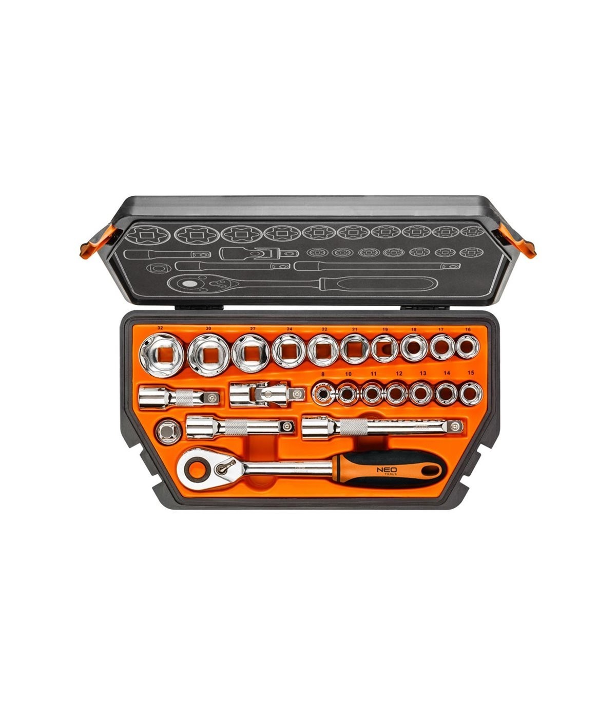 NEO Sada kľúčov 1/2 “ – 23 kusov vyrobených z vysoko kvalitnej chróm-vanádiovej ocele. Sada obsahuje račňu s odolným račňovým mechanizmom (48 zubov), širokú škálu nástavcov (veľkosť od 8 do 32 mm), predĺženie, spoj a adaptér 1/2″M x 3/8″F. Dodávané v praktickom púzdre. Kvalita náradia je potvrdená certifikátom TÜV a 25-ročnou zárukou od výrobcu. Značka NEO spĺňa očakávania profesionálov.