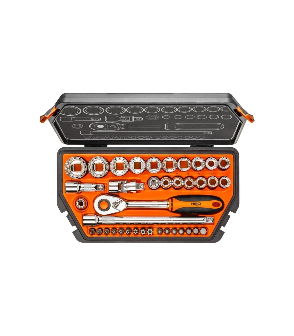NEO Sada kľúčov 1/2 “ – 38 kusov vyrobených z vysoko kvalitnej chróm-vanádiovej ocele. Sada obsahuje račňu s odolným račňovým mechanizmom (48 zubov), širokú škálu nástavcov (veľkosť 10 až 32 mm) a bity (ploché, krížové, šesťhranné, Torx odolné voči manipulácii). Sférický tvar nástavca umožňuje všestranné použitie pri uvoľňovaní skrutiek. Sada navyše obsahuje predĺženie, univerzálny kĺb a adaptér 1/2″M x 3/8″F. Dodávané v praktickom púzdre. Kvalita náradia je potvrdená certifikátom TÜV a zárukou výrobcu na 25 rokov. Značka NEO spĺňa očakávania profesionálov.