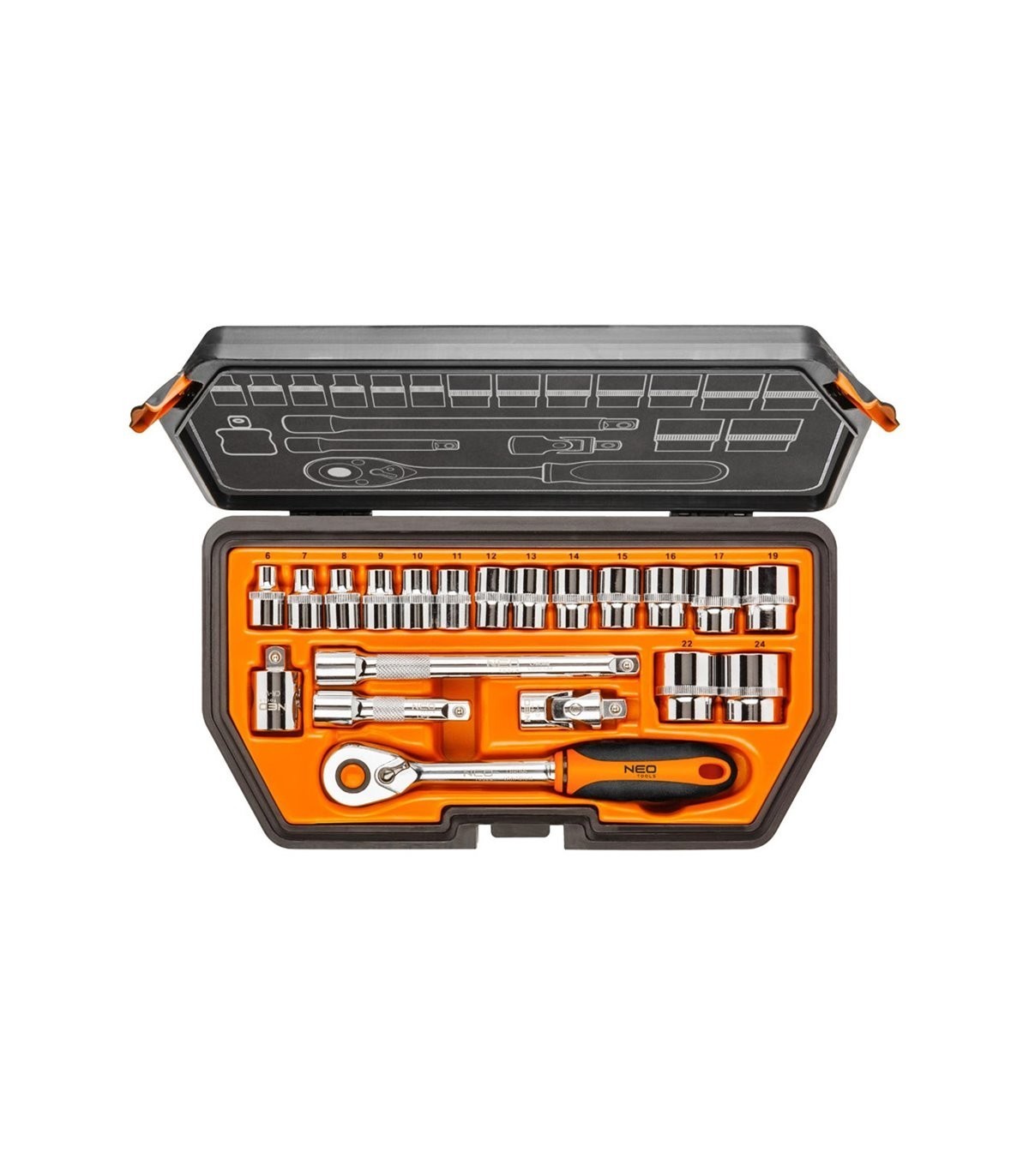 NEO Sada kľúčov 3/8 “ – 20 kusov vyrobených z vysoko kvalitnej chróm-vanádiovej ocele. Sada obsahuje račňu s odolným račňovým mechanizmom (48 zubov), širokú škálu nástavcov (veľkosť od 6 do 24 mm), predĺženie, spoj a adaptér 3/8″M x 1/2″F. Dodávané v praktickom púzdre. Kvalita náradia je potvrdená certifikátom TÜV a zárukou výrobcu na 25 rokov. Značka NEO spĺňa očakávania profesionálov.
