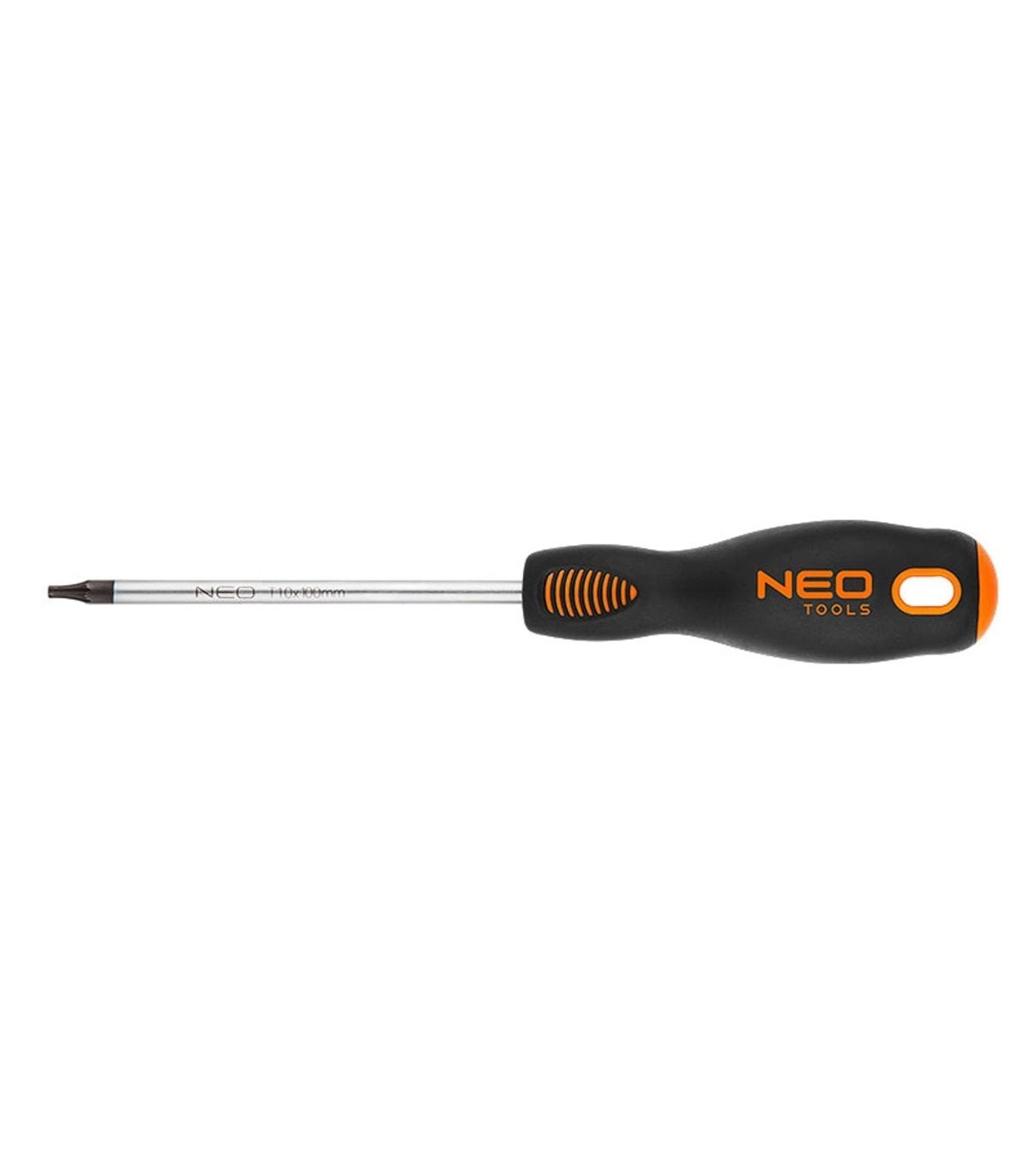 NEO Skrutkovač Torx. Driek skrutkovača je vyrobený z mimoriadne odolného S2. Čepeľ skrutkovača je tepelne spracovaná, aby sa získala vhodná odolnosť voči ohybu a tvrdosť 56 HRC. Skrutkovač má magnetický hrot. Tvar trojramennej rukoväte s profilovanou opierkou na palec znižuje námahu pri práci a uľahčuje získanie správneho krútiaceho momentu. Rukoväť vyrobená z dvoch materiálov, protišmyková, odolná voči chemikáliám, olejom a tukom. Kvalita nástroja potvrdená certifikátom TÜV a zárukou výrobcu na 25 rokov. Značka NEO spĺňa očakávania profesionálov.