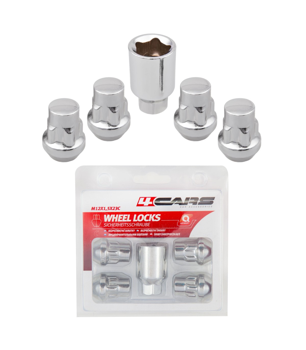 4CARS BEZPEČNOSTNÉ MATICE KOLIES 12×1,5 x 23C sú kvalitné poistné matice určené na ochranu kolies pred odcudzením. Vďaka presnému závitu zabezpečujú spoľahlivé a pevné uchytenie disku k náboju. Špeciálny bezpečnostný profil umožňuje montáž a demontáž iba pomocou priloženého kľúča, čím zvyšuje ochranu vozidla.Matice sú vyrobené z odolnej ocele s povrchovou úpravou proti korózii, čo zaručuje dlhú životnosť a vysokú pevnosť aj pri každodennom používaní. Ideálne riešenie pre oceľové aj hliníkové disky (podľa typu dosadacej plochy).