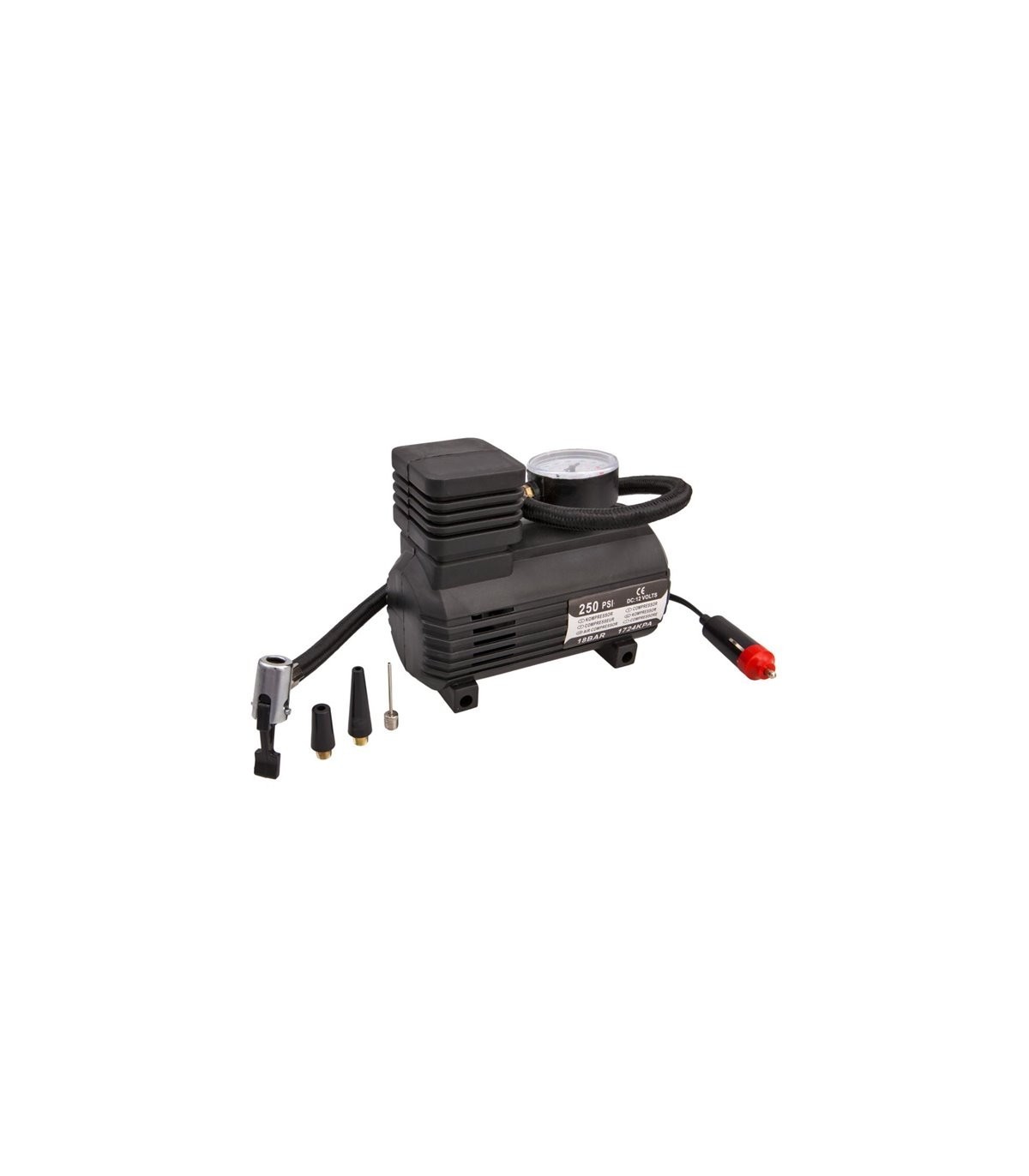 KOMPRESOR 250 PSI, 18 BAR, 12V je výkonné a spoľahlivé zariadenie určené pre rýchle nafúkanie pneumatík áut, motocyklov, kamiónov, karavanov alebo športového vybavenia. Vďaka napájaniu 12V je ideálny pre mobilné použitie priamo z autobatérie, bez potreby elektrickej siete.
