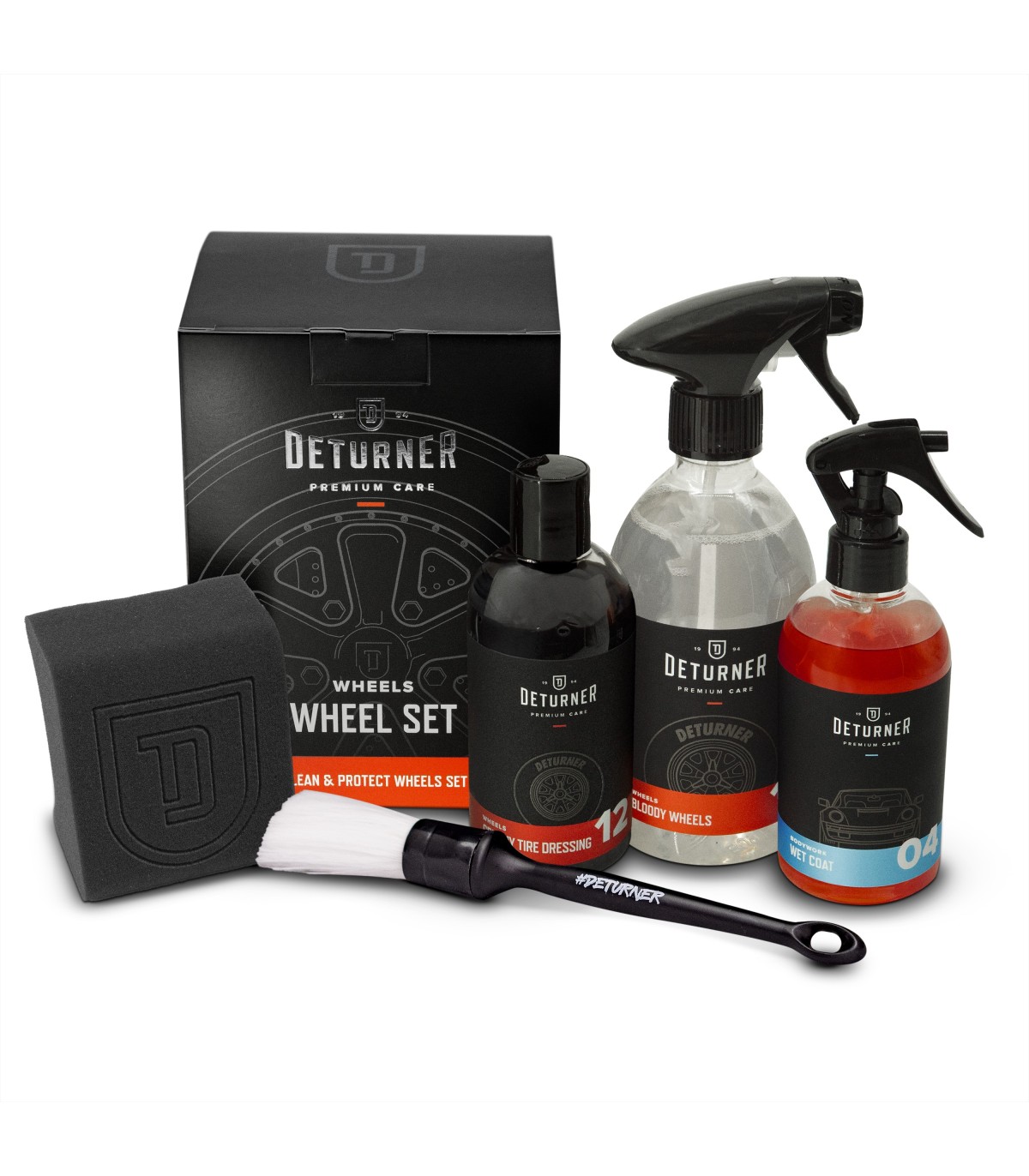 Deturner Wheels Set je profesionálna sada určená na kompletnú starostlivosť o disky a pneumatiky. Vhodná pre každého, kto chce mať kolesá svojho vozidla dokonale čisté, chránené a opticky atraktívne. Sada obsahuje všetko potrebné na dôkladné vyčistenie aj ochranu kolies – od účinného čističa po kvalitný sealant.